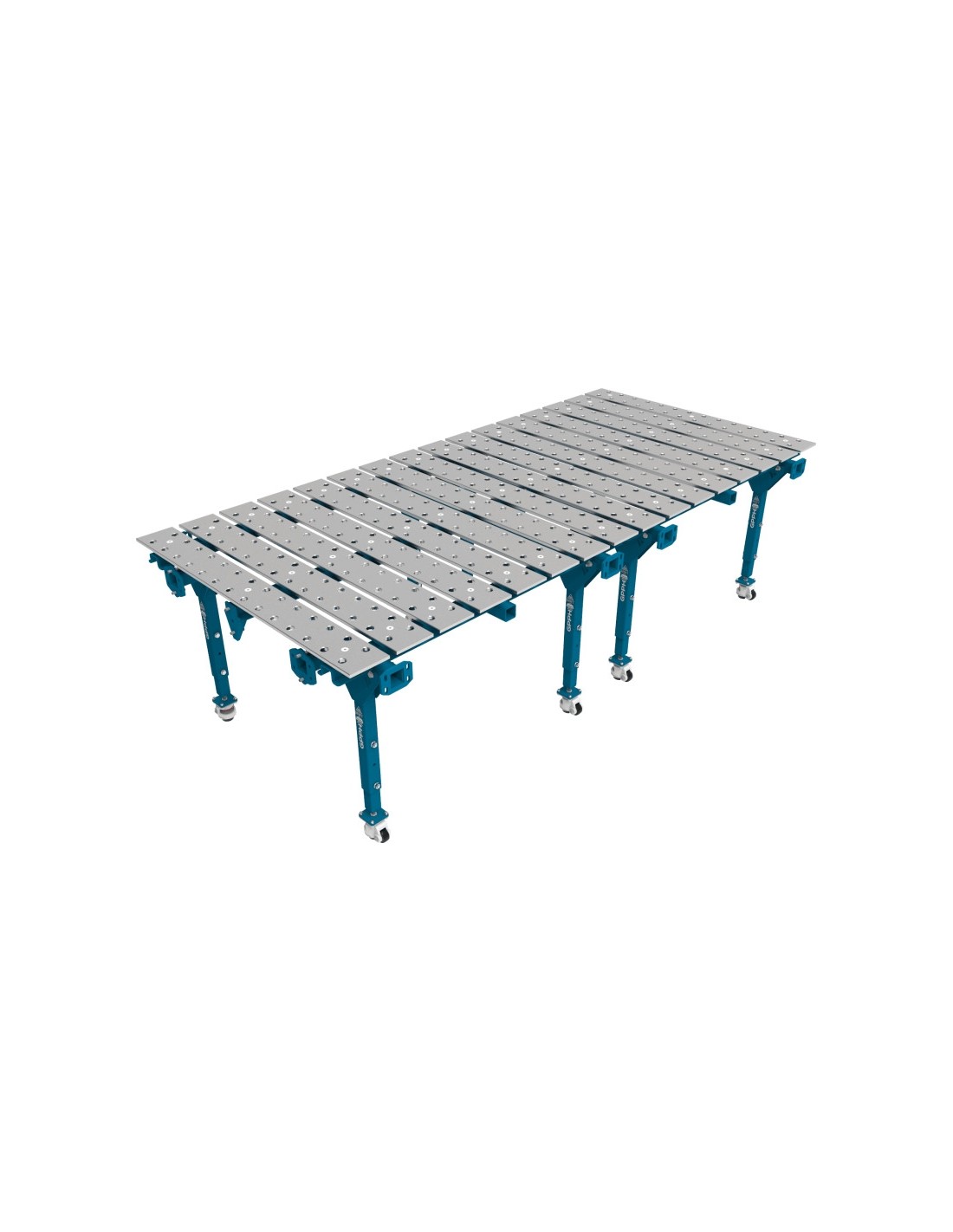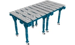 Double modular tables are tandems built from two single tables, and their design allows expansion in any direction. They are available in three size variants: 2000×1000, 2400×1200, and 3200×1500. The tabletop consists of milled, sliding plates 15 mm thick; by adjusting the surface you achieve excellent flatness. The system uses Ø28 mm holes in a 100×100 mm grid, with milled and chamfered openings that make tool mounting easier. The tables are compatible with PRO-series tools, and the slots between the plates provide additional clamping points for improved ergonomics.