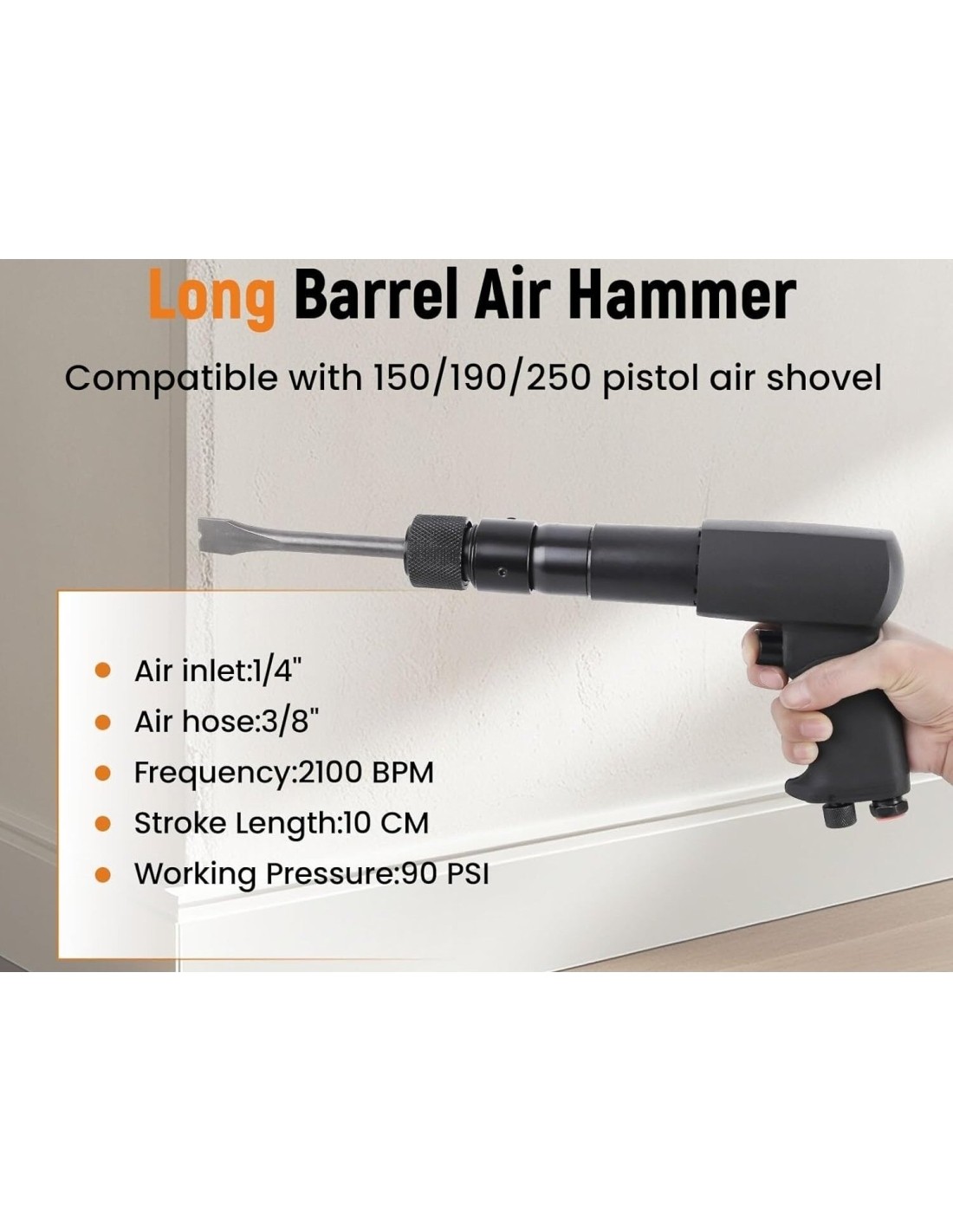 This vibration reduced long barrel air hammer can produce up to 2100 blows per minute so you can speed through your tasks with ease. Compatible with 150/190/250 pistol air shovel