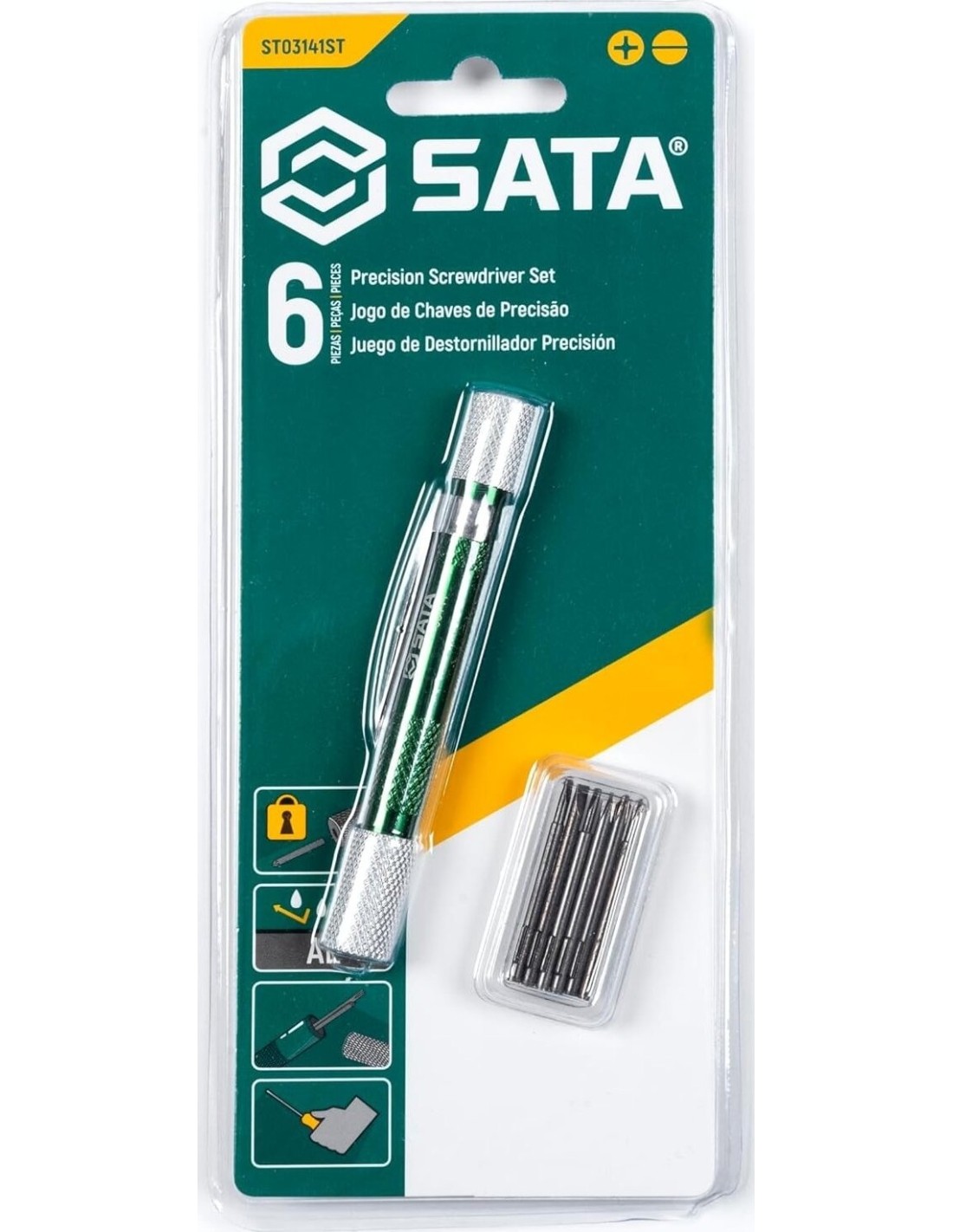 Šešių tipų miniatiūriniai antgaliai, tinkami įvairiems mažiems kryžminiams ir plokštiems varžtams.