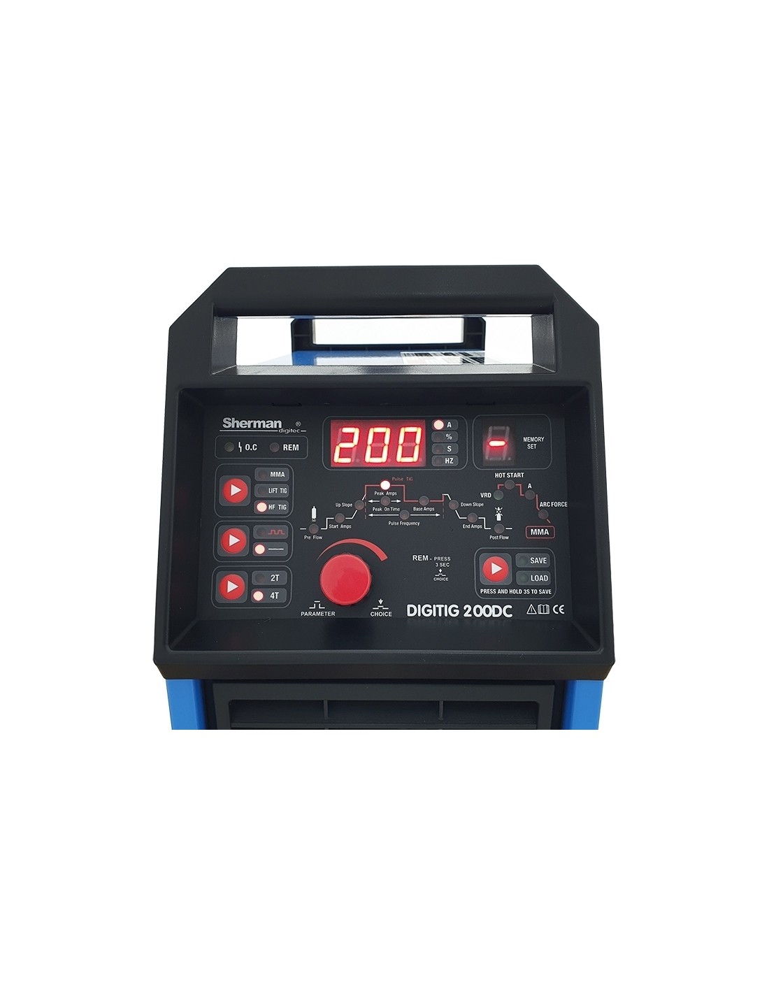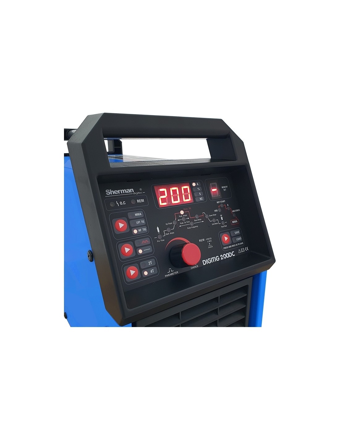 The unit enables fully digital adjustment and control of welding parameters, arc characteristics, and TIG pulse. For MMA, it provides VRD, ARC FORCE, and HOT START functions. It operates in 2T/4T modes and features separate readouts for welding current and memory set selection.