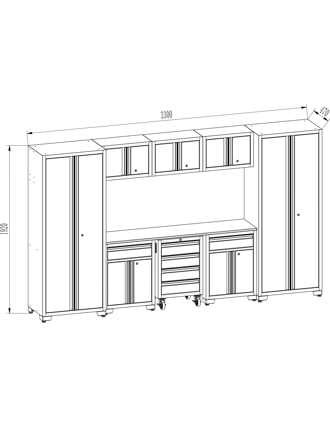 With a total width of 3300 mm, this heavy-duty tool cabinet set provides a comprehensive storage solution, combining functionality and durability to enhance your workspace efficiency.