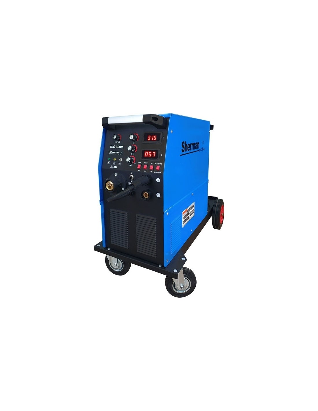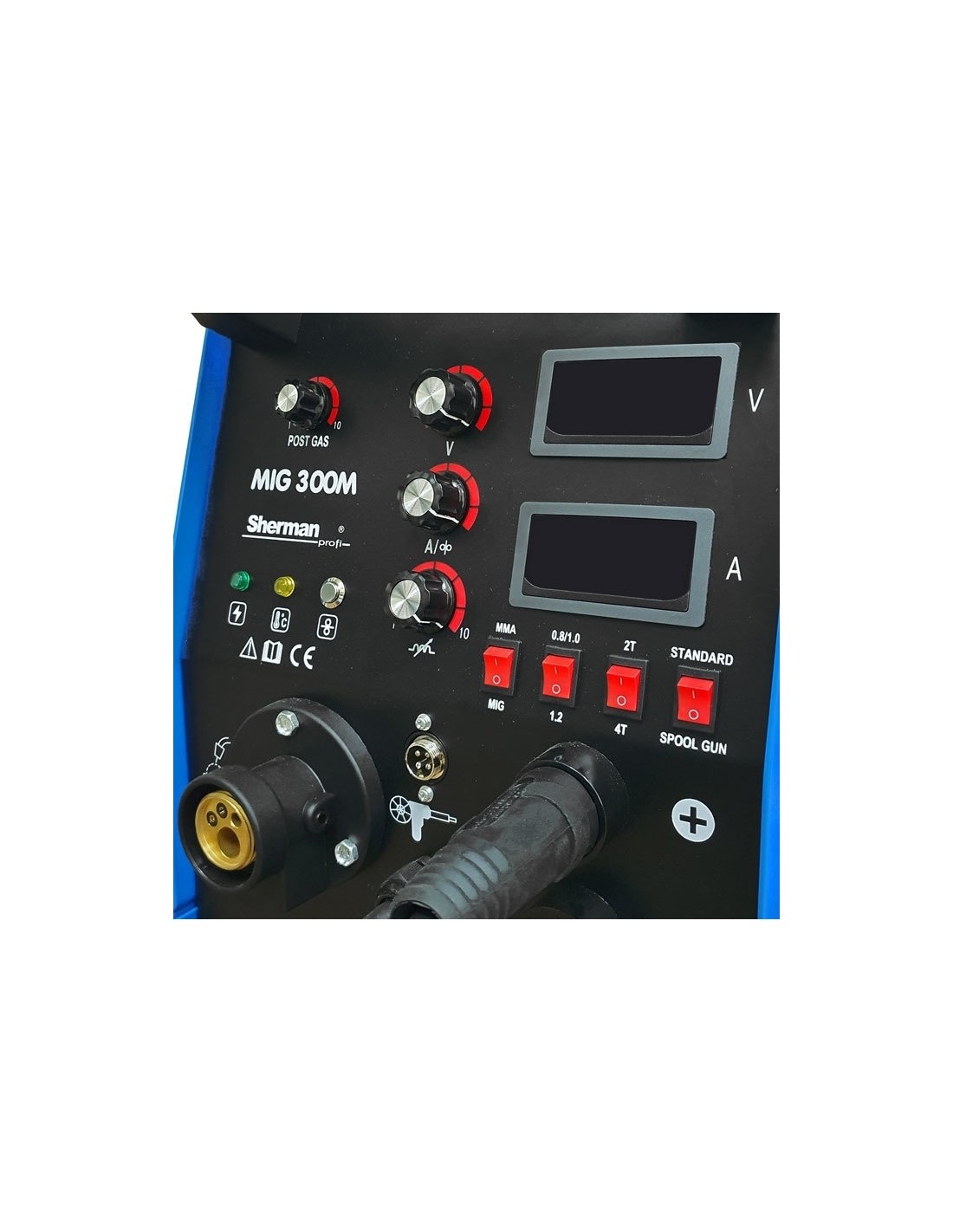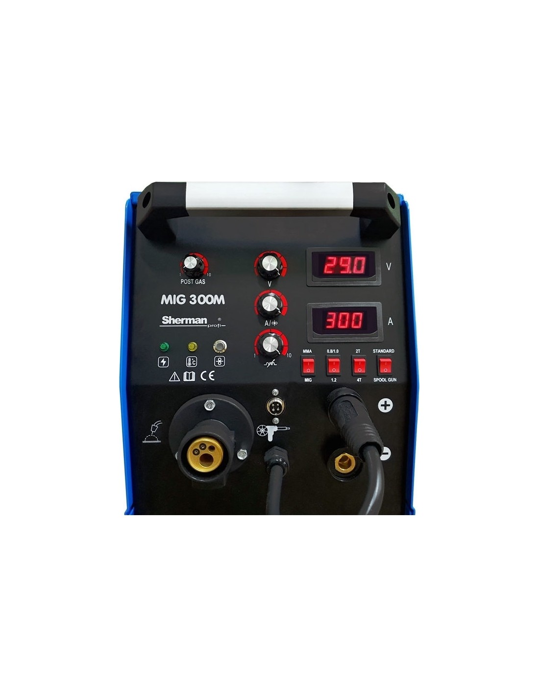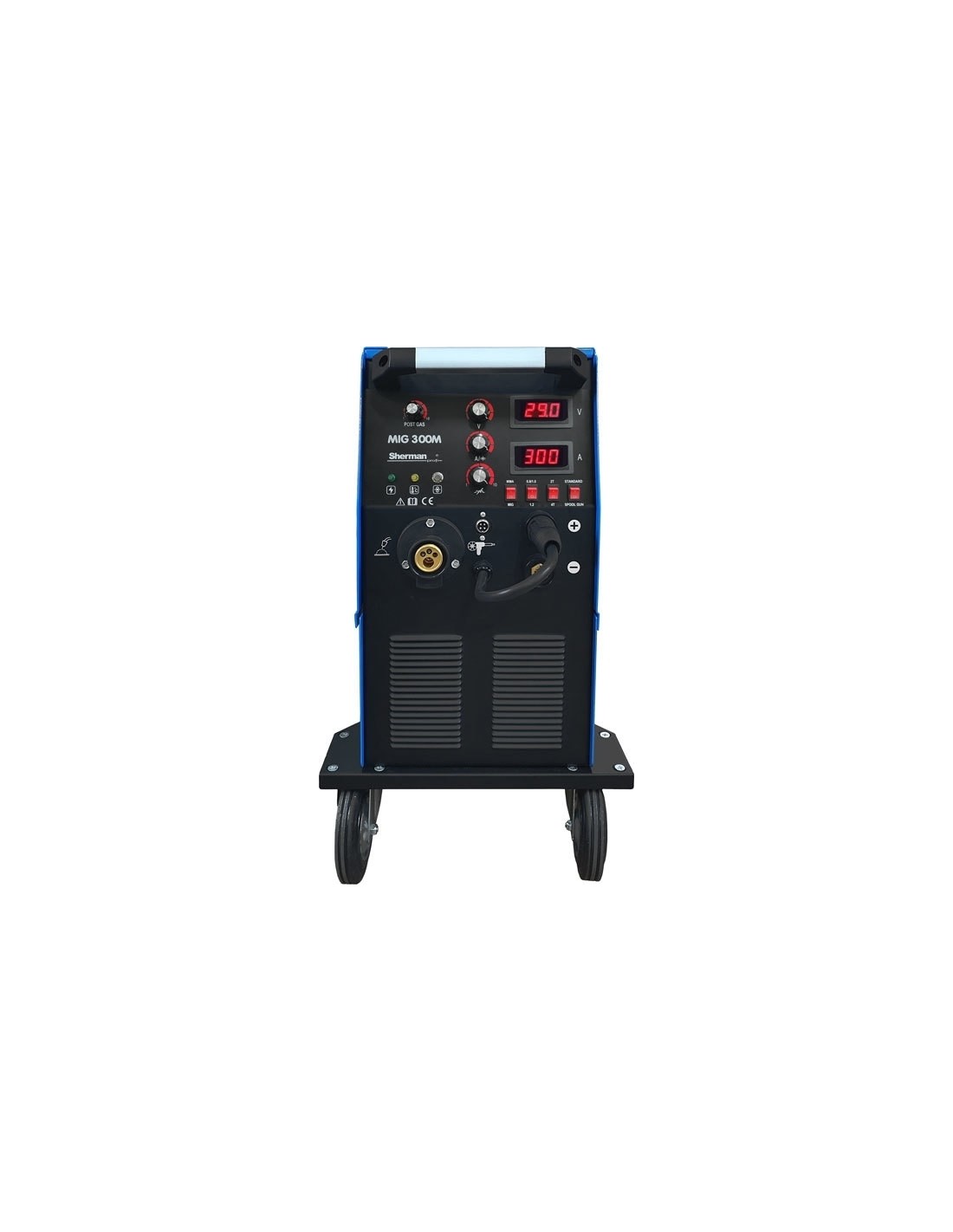 The MIG 300M is a second‑generation welding machine built with IGBT inverter technology. It is designed for manual welding of steel and non‑ferrous metals in shielding gas (MIG/MAG) and with coated electrodes (MMA). It can also be used for gasless welding with flux‑cored wire, and supports work with 100 mm wire spools using a welding torch.