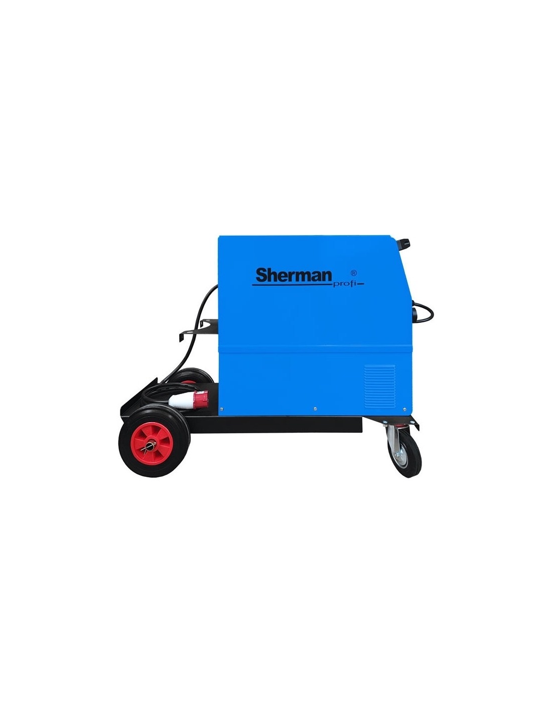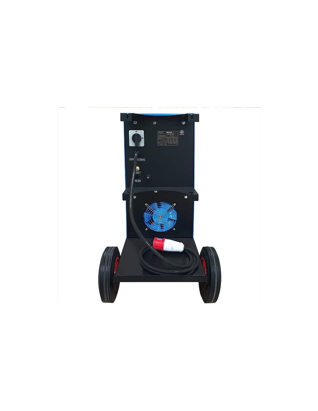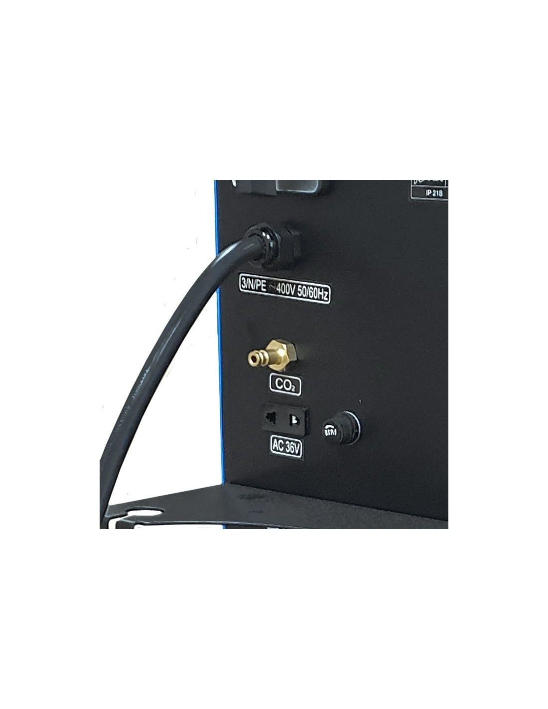 The unit is powered by a three‑phase 3x400 V supply. A professional 4‑roll wire feeder provides smooth, adjustable feed speed from 3 to 18 m/min. Welding voltage for MIG/MAG and welding current for MMA are steplessly adjustable. The machine offers 2T/4T trigger modes and inductance control, which is useful for thin sheet metal. Thermal overload protection safeguards the device. It works with K‑200 (5 kg) and K‑300 (15 kg) wire spools (Ø200/300 mm). Duty cycle is 60% up to 300 A, MIG voltage range 16.5–29 V, and open‑circuit voltage 59 V.