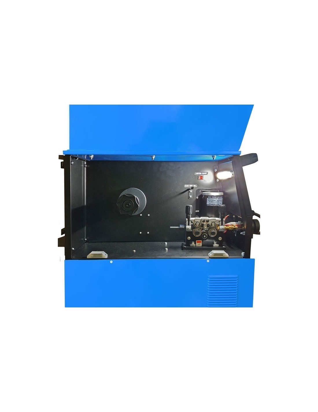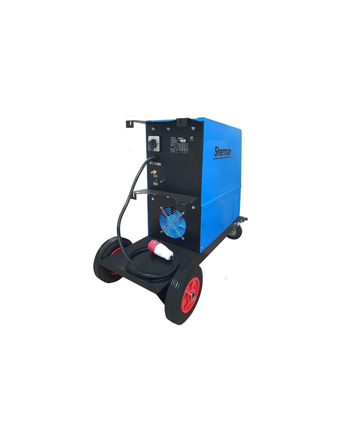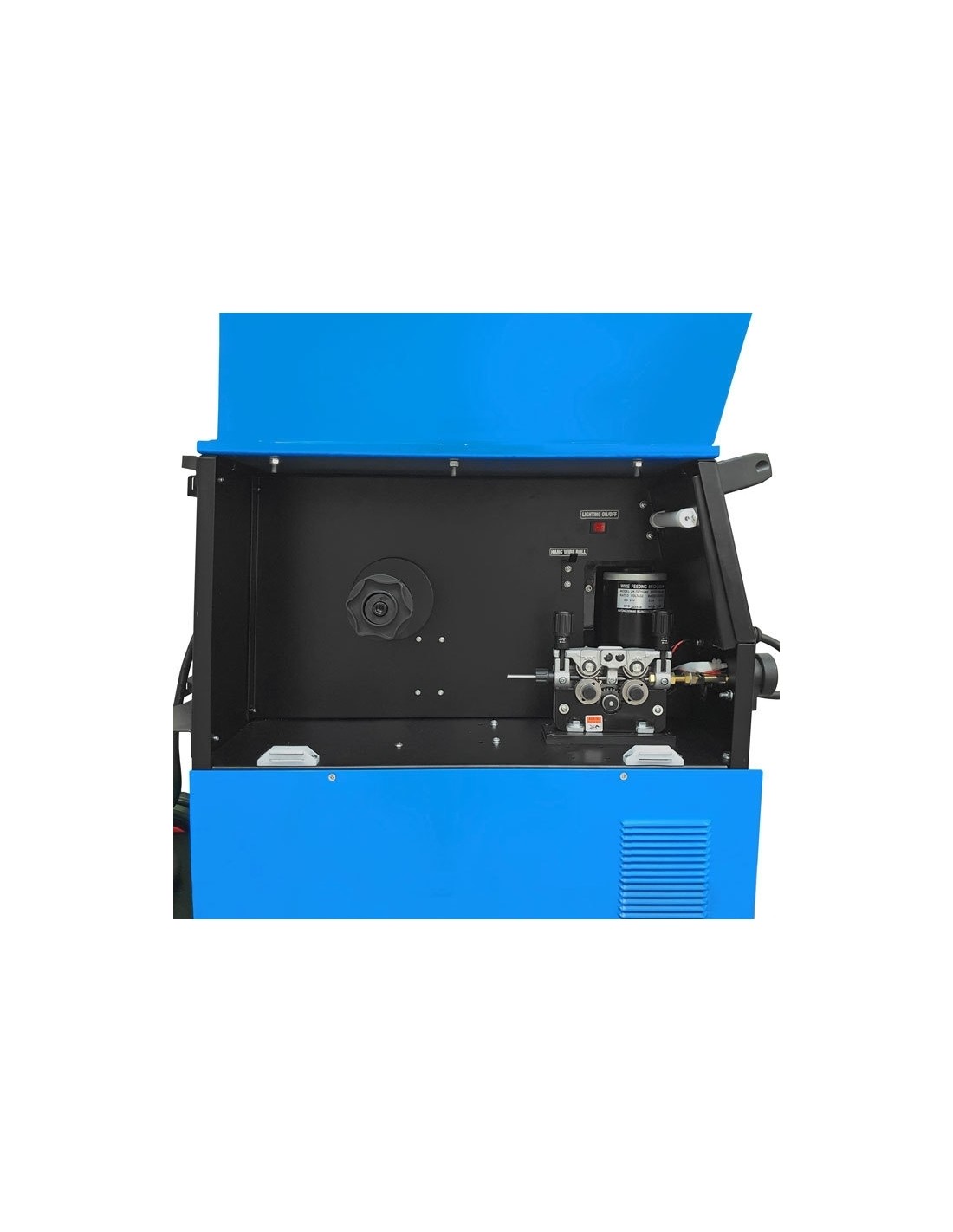 The unit is powered by a three‑phase 3x400 V supply. A professional 4‑roll wire feeder provides smooth, adjustable feed speed from 3 to 18 m/min. Welding voltage for MIG/MAG and welding current for MMA are steplessly adjustable. The machine offers 2T/4T trigger modes and inductance control, which is useful for thin sheet metal. Thermal overload protection safeguards the device. It works with K‑200 (5 kg) and K‑300 (15 kg) wire spools (Ø200/300 mm). Duty cycle is 60% up to 300 A, MIG voltage range 16.5–29 V, and open‑circuit voltage 59 V.