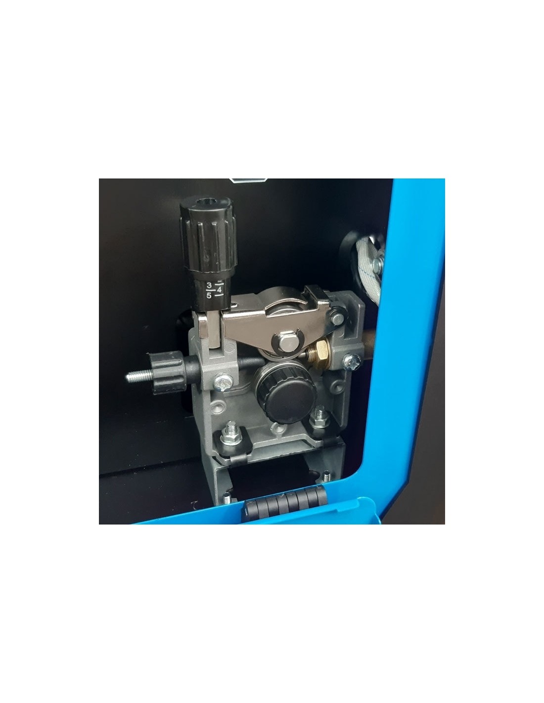 The welder comes with a unique MIG torch with a knob on the handle for remote adjustment of voltage/welding current during synergic operation.
