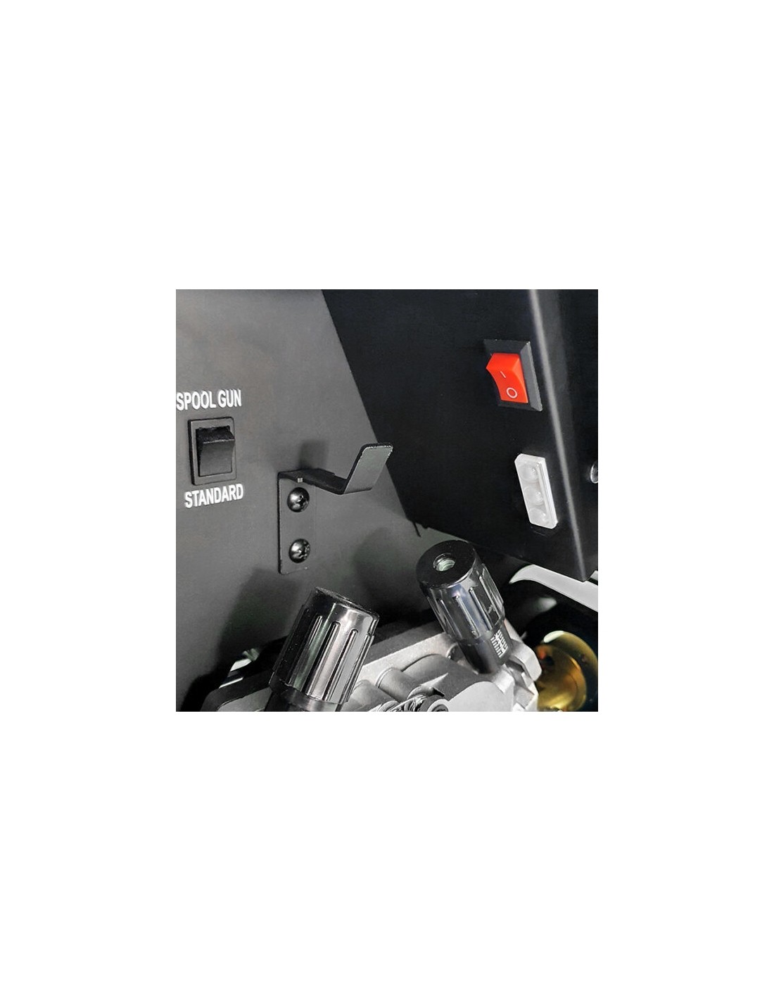 The unit allows connection of a Spool Gun (SG) torch with an integrated mini wire feeder and a D100 spool of steel or non‑ferrous wire.