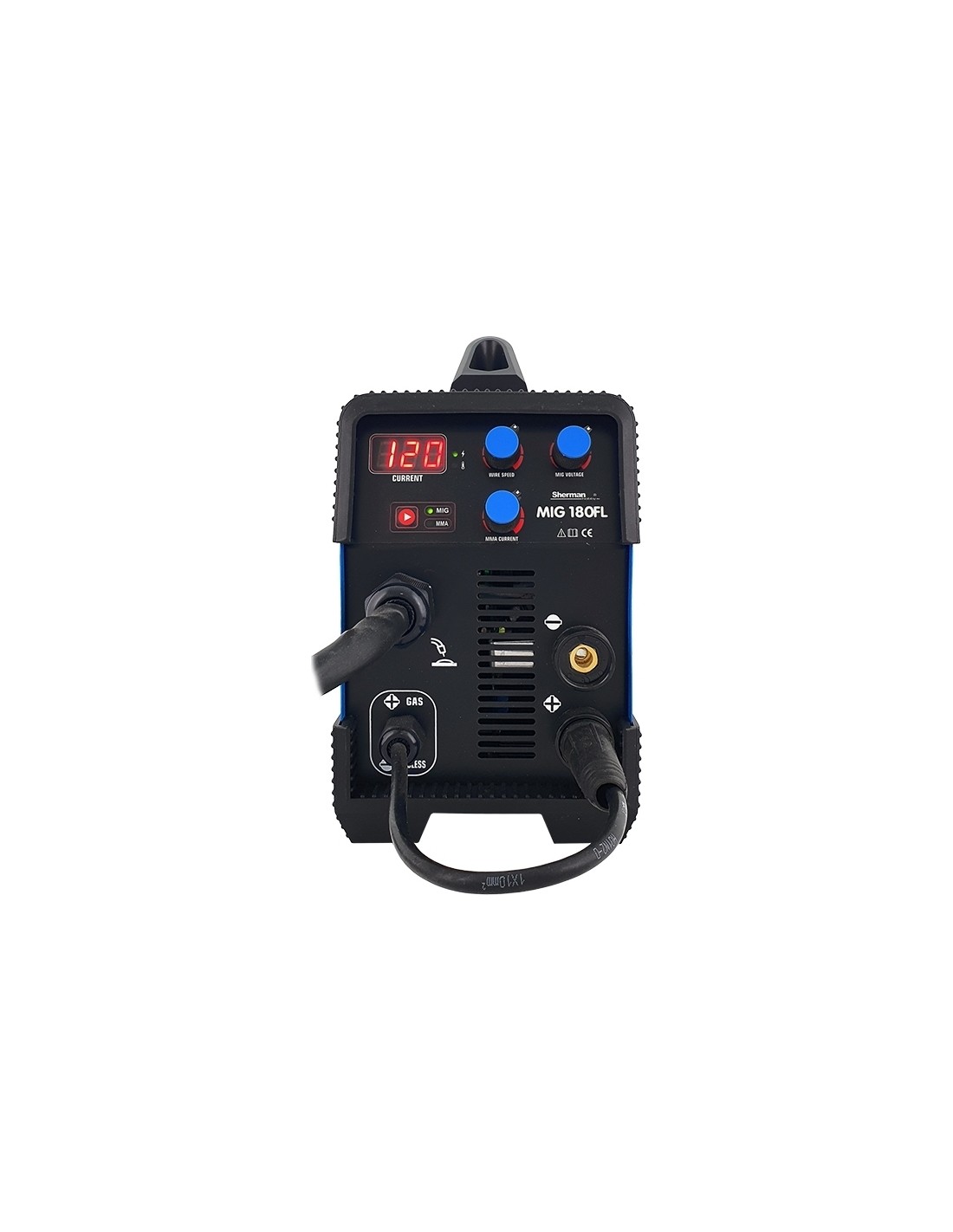 The semi-automatic welder MIG 180FL is designed for manual welding of steel and non-ferrous metals. It supports MIG/MAG and MMA (shielded electrode) methods. By changing polarity, it enables welding with both standard wires in shielding gas and self-shielded flux-cored wires. Built on IGBT inverter technology, it offers reduced weight and size. The MIG 180FL works with D100 (Ø100 mm) wire spools, 1 kg.