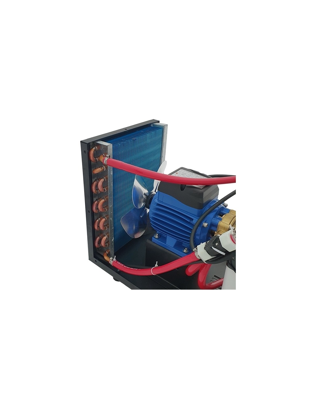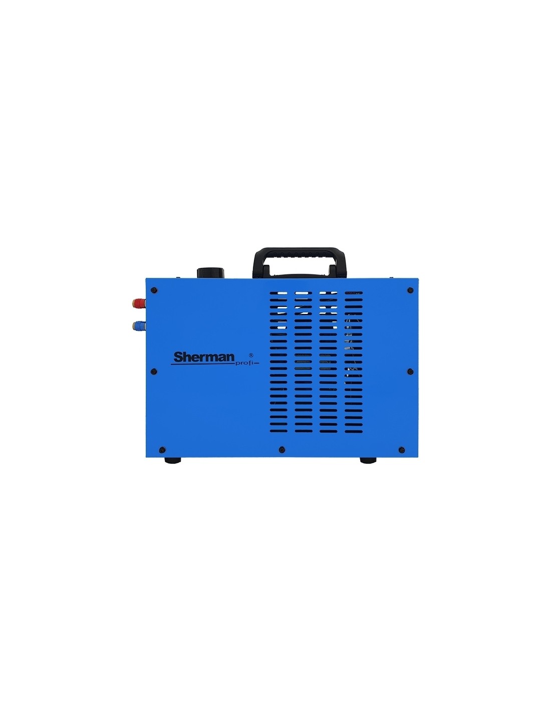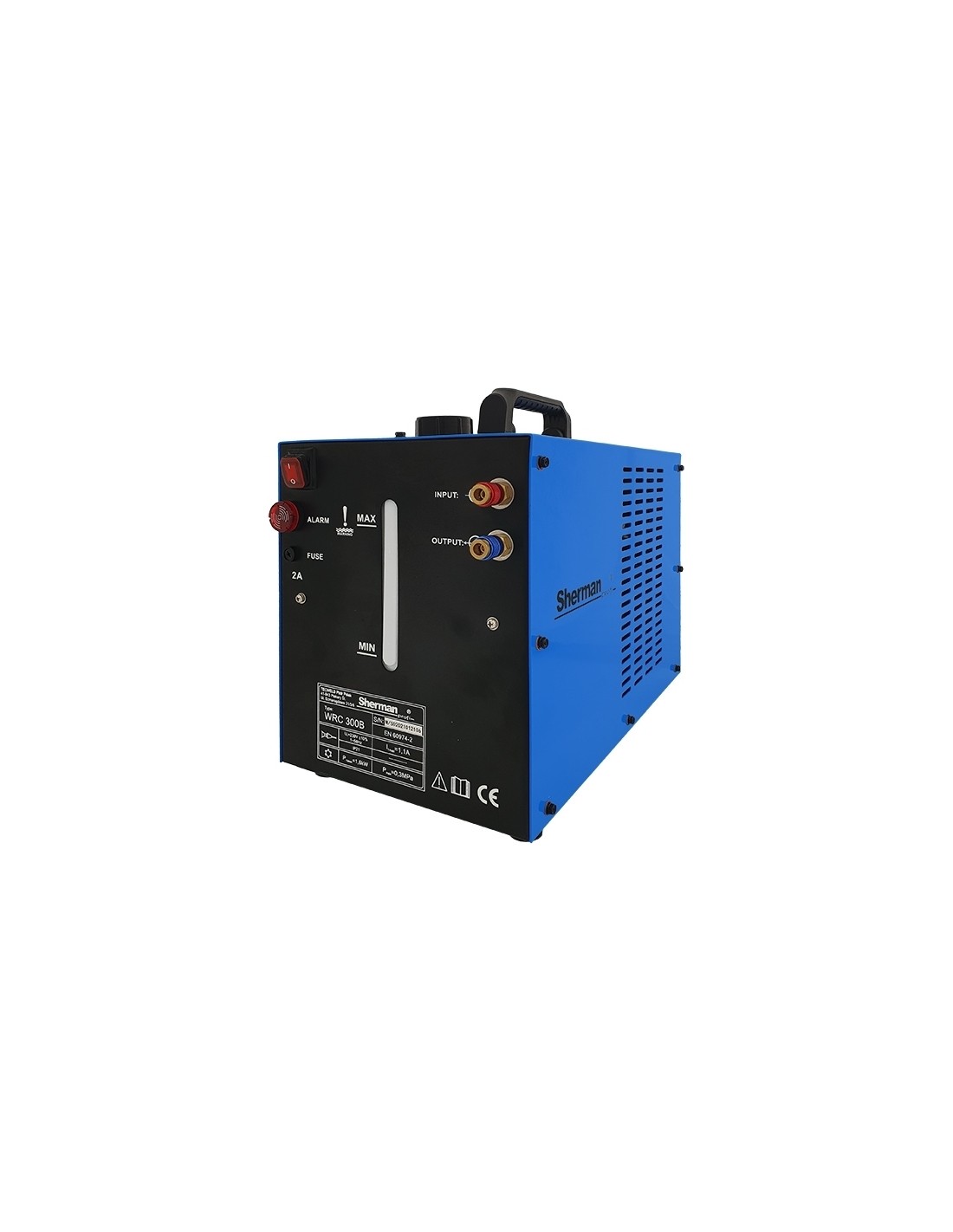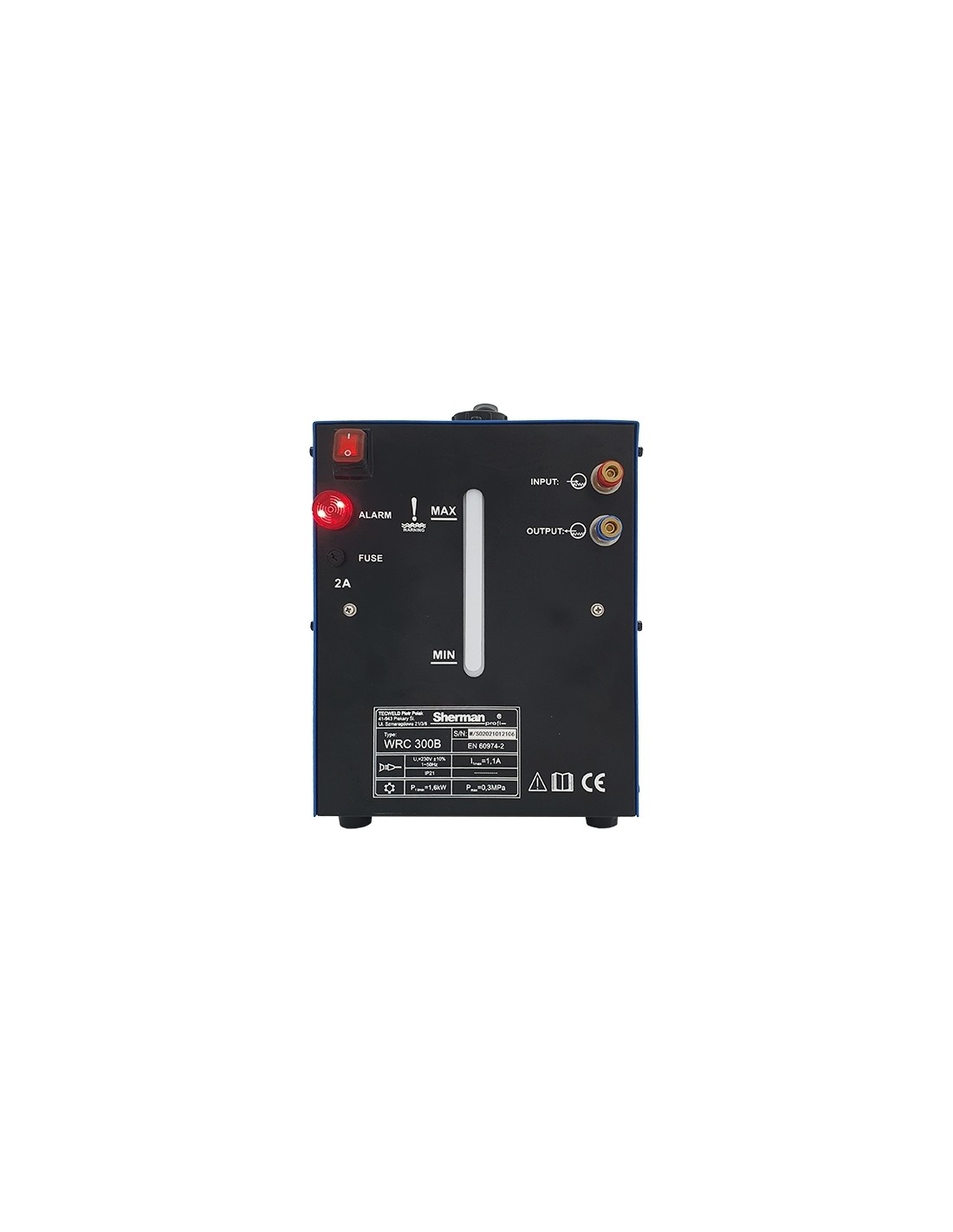 The WRC 300B ALARM cooler is a fully professional unit for liquid cooling of MIG/MAG and TIG welding torches, as well as other components and equipment that require a closed cooling circuit. Designed for continuous operation, it features a simple, compact design. A heat exchanger built on a copper coil significantly improves cooling efficiency and extends the device’s service life. The unit is equipped with a flow sensor with visual and audible alarms. The sensor triggers an alert when there is no coolant flow due to a blockage in the water lines, open fluid circulation, or a low fluid level in the tank; once the cause is removed, the alarm switches off automatically.