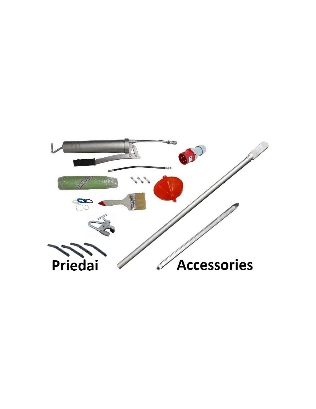 Priedai: tepalo presas, ratlankio borto fiksatorius, CE rozetė, tepalas, piltuvas, manžetai, saugiklis 3 vnt., šepetys montavimo pastai, trumpa svirtis, ilga svirtis, plastikinės juostelės 4 vnt.