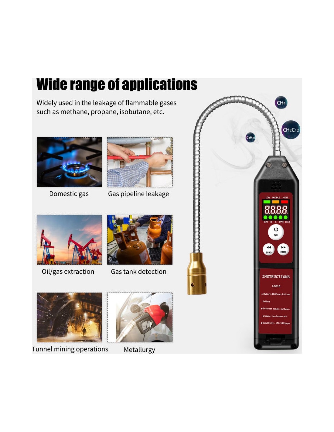 Dideliu jautrumu (100–9999 ppm) aptinka CH4, C3H8 ir C4H10 dujas. Turi reguliuojamą jautrumą, garsinį signalą, nutildymo režimą ir USB įkrovimą. 360° lankstus zondas leidžia lengvai aptikti nuotėkį sunkiai pasiekiamose vietose.
