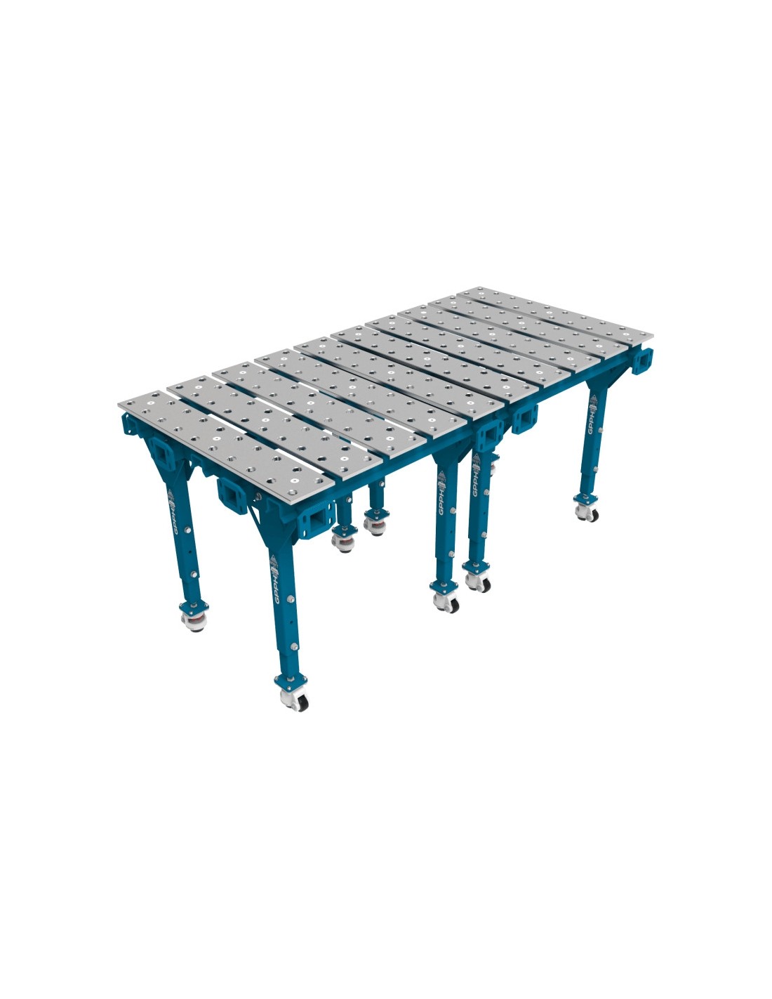 Dvigubi moduliniai stalai – tai du iš vienviečių stalų sudaryti tandemai, kurių konstrukcija leidžia plėsti sistemą bet kuria kryptimi. Galimi trys dydžiai: 2000×1000, 2400×1200 ir 3200×1500. Stalviršį sudaro frezuotos, slankiojančios 15 mm storio plokštės; reguliuodami jų padėtį pasieksite puikų lygumą. Naudojama Ø28 mm skylių sistema 100×100 mm tinklelyje, o frezuotos ir nuožulnintos angos palengvina įrankių tvirtinimą. Stalai suderinami su PRO serijos įrankiais, o tarpai tarp plokščių suteikia papildomų tvirtinimo vietų patogesniam darbui.