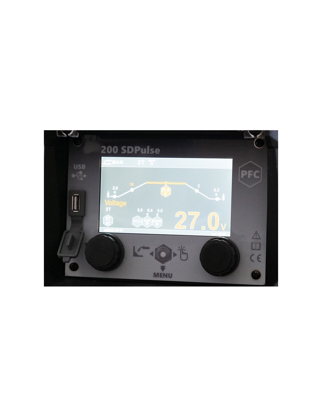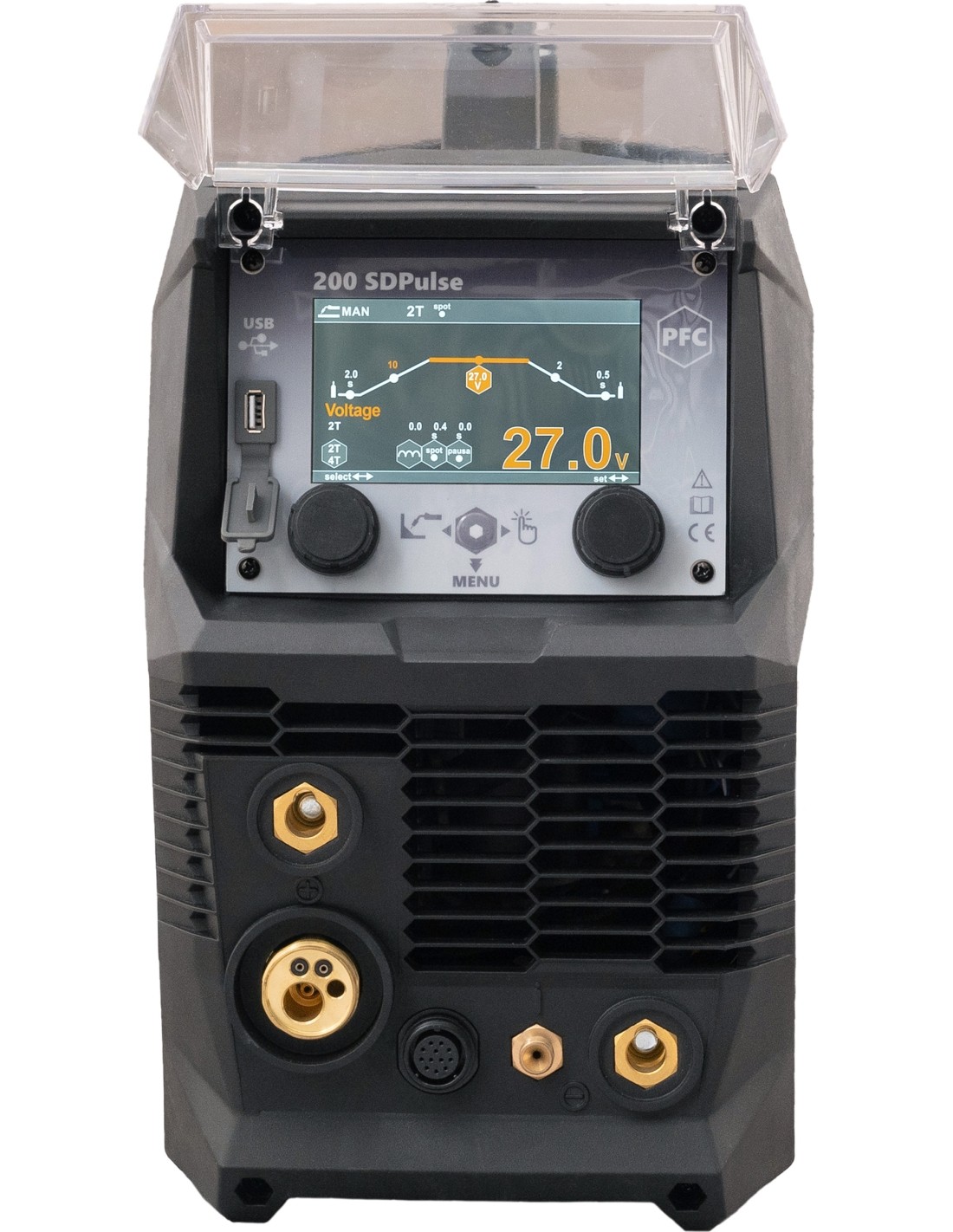 Aparatas turi 5 colių LCD ekraną, kuriame rodoma visa svarbi informacija apie suvirinimo parametrus. Jis taip pat palaiko sinerginius režimus, kurie leidžia lengvai sureguliuoti nustatymus pagal skirtingas medžiagas (plienas, nerūdijantis plienas, aliuminio lydiniai, cinkuotas metalas, miltelinė viela).